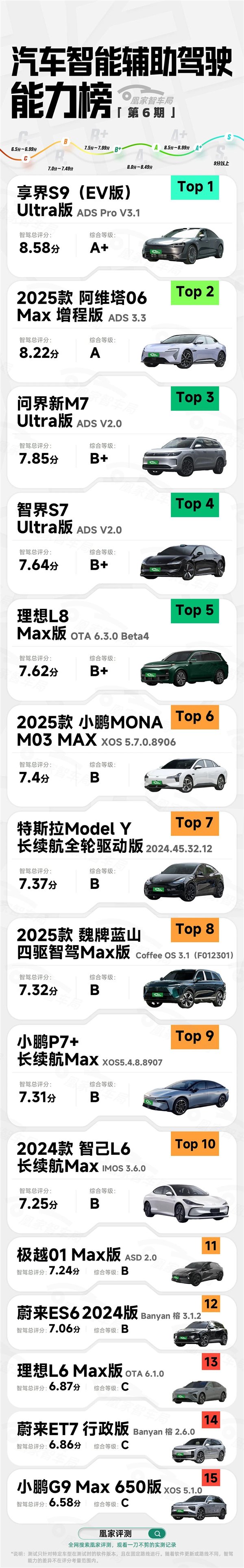 其中,享界S9 Ultra版以显著优势位居榜首,智驾总评分8.58分,是唯一一款综合等级A+级车型。